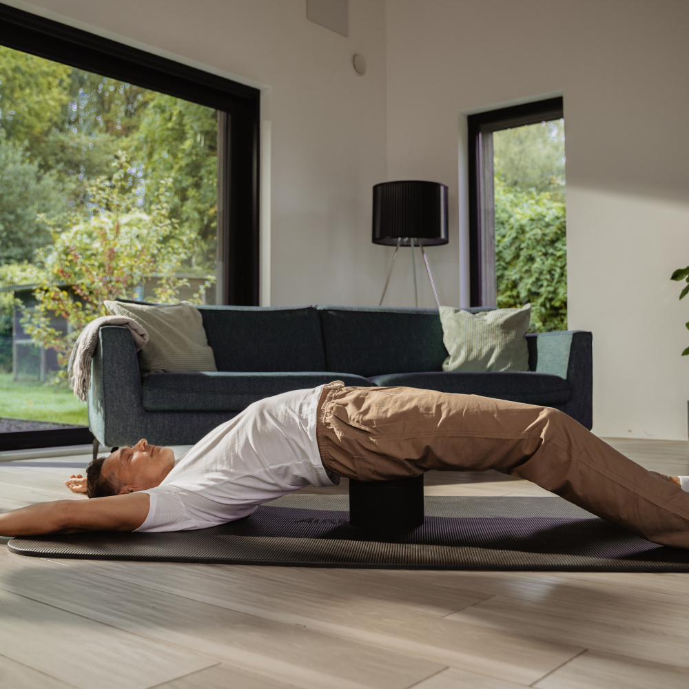 Lege zunächst nur einen der beiden Aufsätze ohne Sockel direkt unter deine Brustwirbelsäule. Diese beginnt von unten dort, wo du hinten die ersten Rippen spürst.